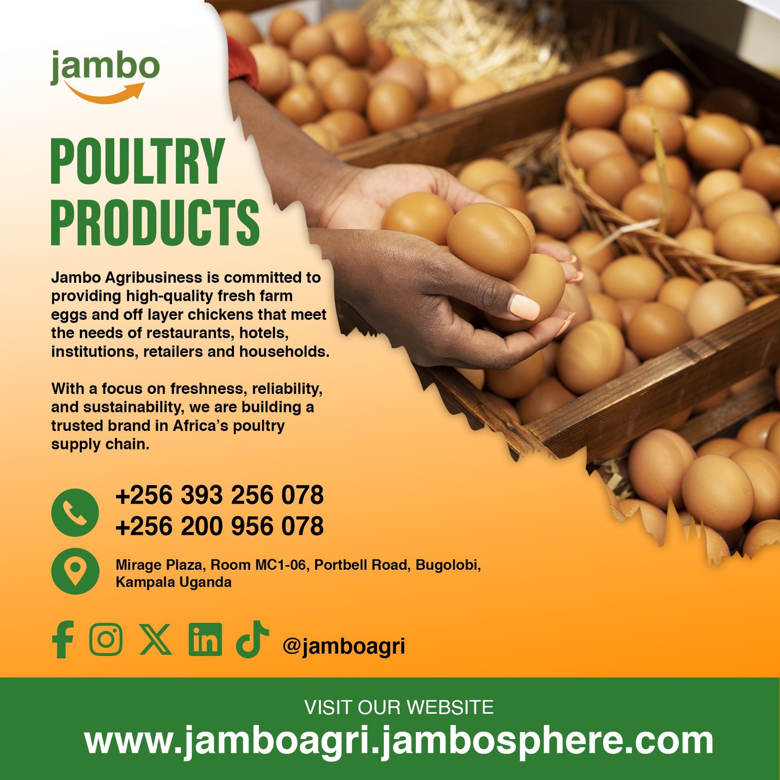 Jambo Agribusiness focuses on poultry and agricultural production, delivering quality eggs and livestock products while promoting sustainable farming practices and food security.